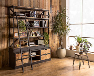 上段のものを取るための梯子が粋なスタイルです。