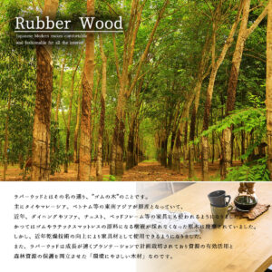 ラバーウッドとはその名の通り、”ゴムの木”のことです。 主にタイやマレーシア、ベトナム等の東南アジアが原産となっていて、 近年、ダイニングやソファ、チェスト、ベッドフレーム等の家具にも使われるようになりました。 かつてはゴムやラテックスマットレスの原料になる樹液が採れなくなった原木は廃棄されていました。 しかし、近年乾燥技術の向上により家具材として使用できるようになりました。 また、ラバーウッドは成長が速くプランテーションで計画栽培されており資源の有効活用と 森林資源の保護を両立させた「環境にやさしい木材」なのです。