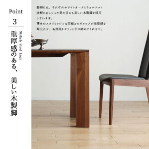脚部には、それぞれホワイトオークとウォルナット 突板をあしらった見た目にも美しい木製脚を採用 しています。 薄めのスタイリッシュな天板とのギャップが重厚感を 際立たせ、お部屋をキリッと引き締めてくれます。