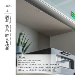 オープン収納部とスライド棚の部分にモイスの板が使用されており、炊飯器やオーブントースター、ケトルなどが発する上記を吸着、吸湿してくれます。