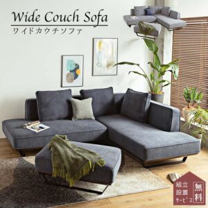 当ショップオススメのオットマン付きソファは、カウチソファとセットになっているため、統一感があり、また光沢のあるファブリック地なので高級感もあります。