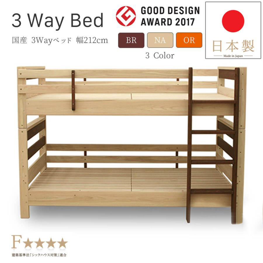 F00665_国産 日本製 二段ベッド KOTOKA コトカ 3way グッドデザイン賞 グッドデザインアワード受賞 耐荷重900kg 3色対応 2段ベッド シングルベッド キングサイズベッド 子供用 大人用 日本製 木製 ひのき 檜 桧 木製 天然木 おしゃれ フォースター 子供部屋 大型