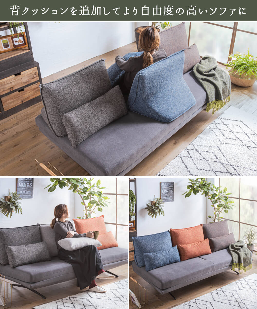 | 特徴 | リビングソファーとしてもダイニングソファーとしても使えお部屋の主役になれるソファ。 便利に使える組み換え自在のクッションは座椅子としてもお使いいただけます。 オプションでクッションを追加すれば自由度が更に広がります。 |