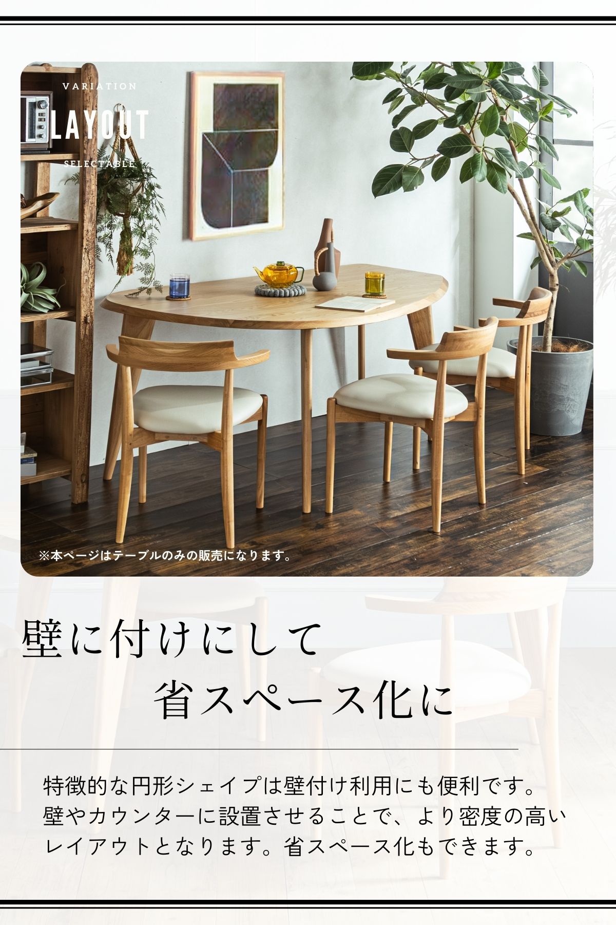 F02056_ダイニングテーブル 単品販売 変形 円形 楕円形 オーバル 幅160cm ラバーウッド無垢材 オーク突板 北欧風 おしゃれ テーパード脚 ナチュラル ブラウン 省スペース 壁付け