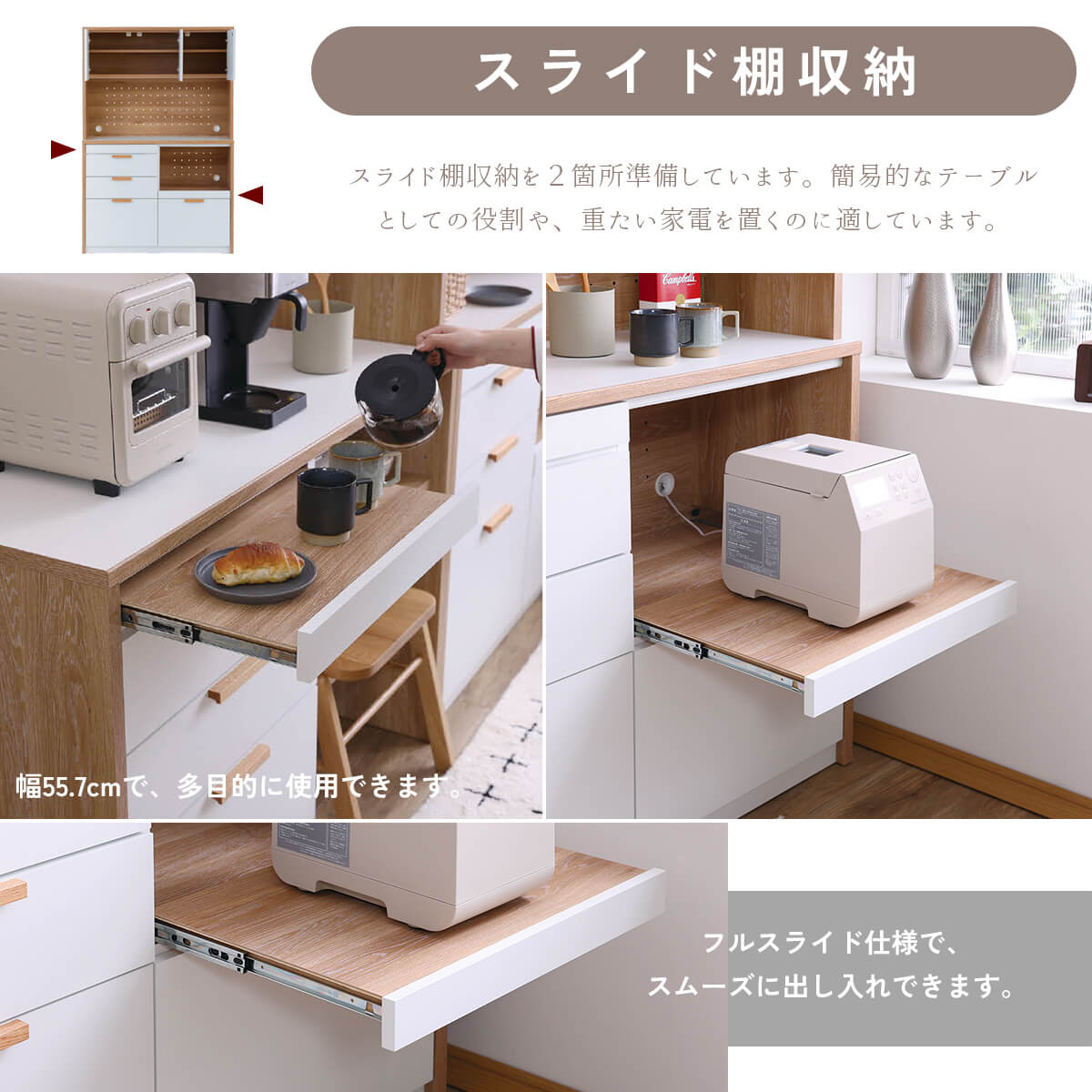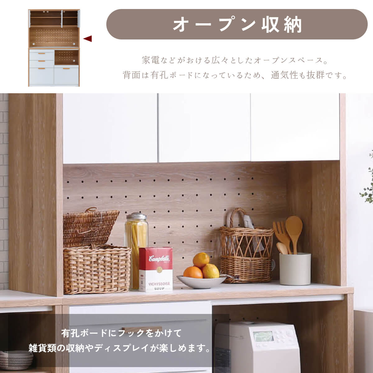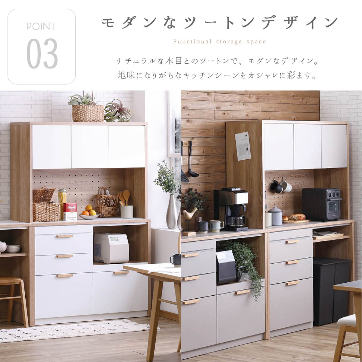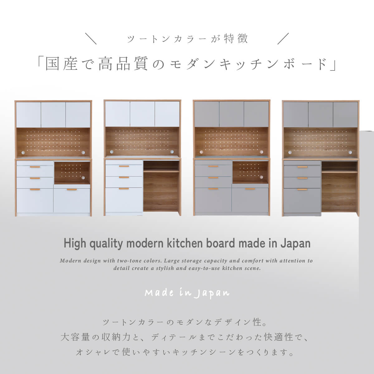 | 特徴 | ツートンカラーが特徴の食器棚。オープン部分は有孔ボードを使って収納できます。また、作業台としても使えるスライドテーブル付きです。炊飯器などの水蒸気も気にせず置けるモイスもついています。便利なコード穴もあります。揺れると扉をロック「耐震ラッチ」も装備。グレー色とホワイト色の2色展開です。 |