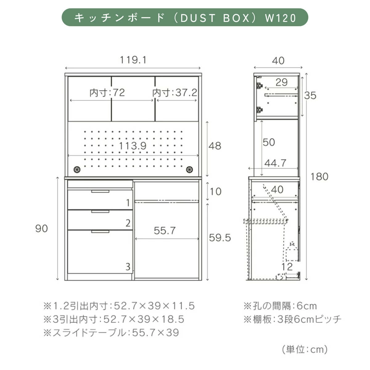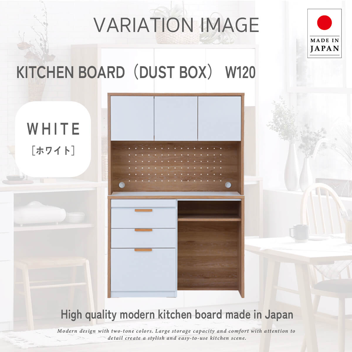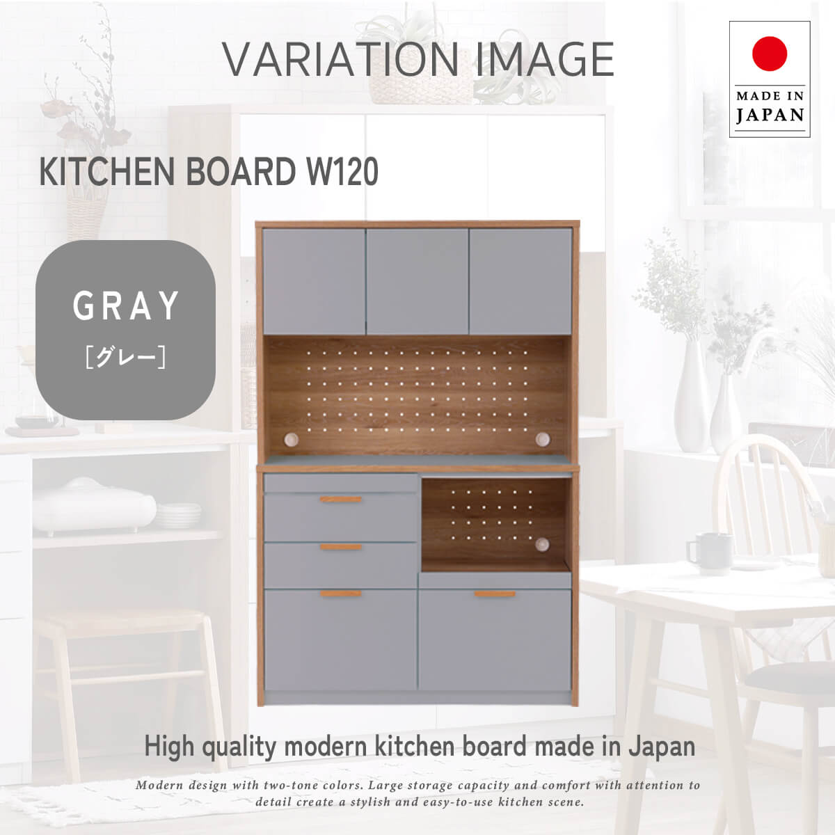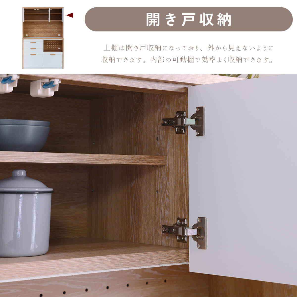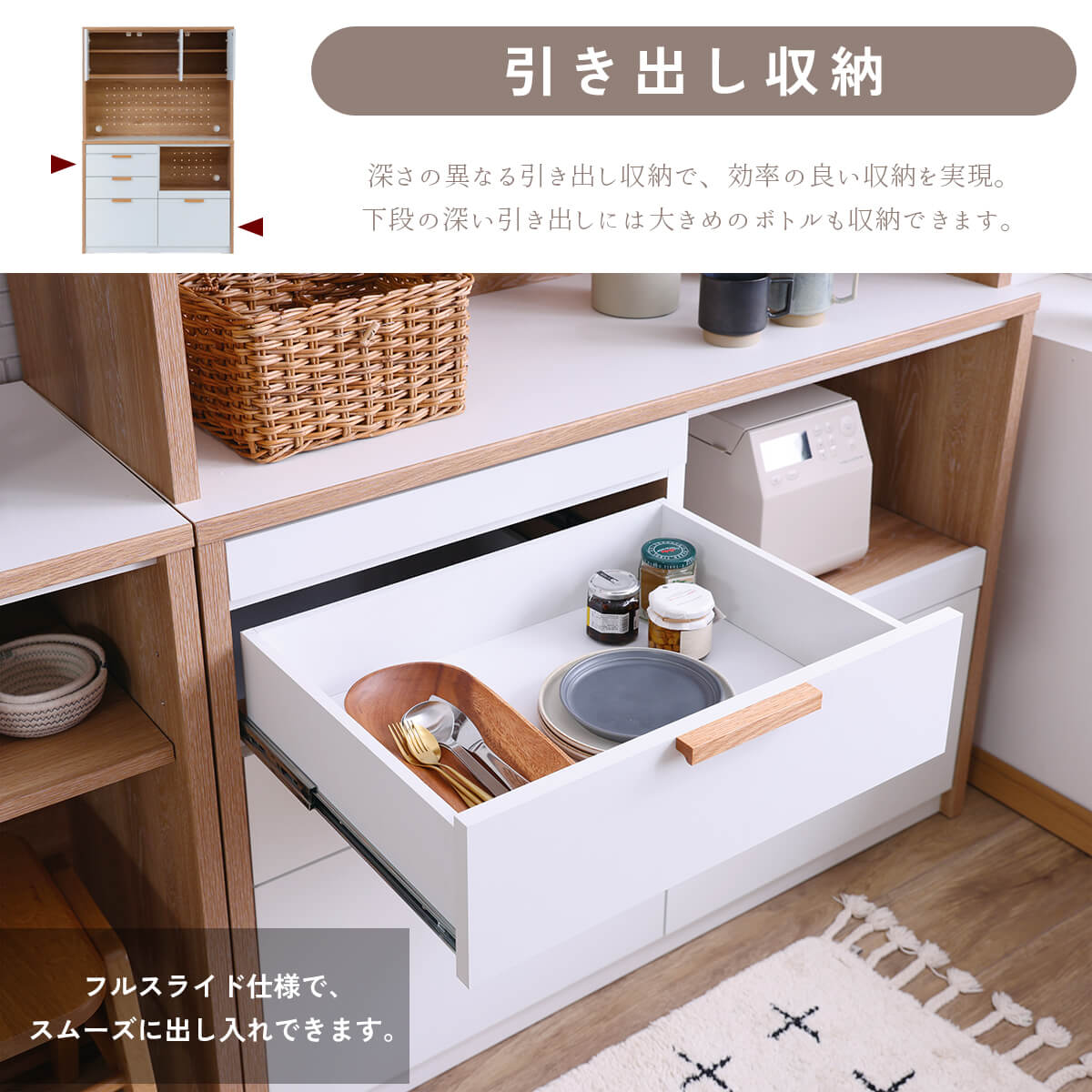| 特徴 | ツートンカラーが特徴の食器棚。オープン部分は有孔ボードを使って収納できます。また、作業台としても使えるスライドテーブル付きです。炊飯器などの水蒸気も気にせず置けるモイスもついています。便利なコード穴もあります。揺れると扉をロック「耐震ラッチ」も装備。グレー色とホワイト色の2色展開です。 |