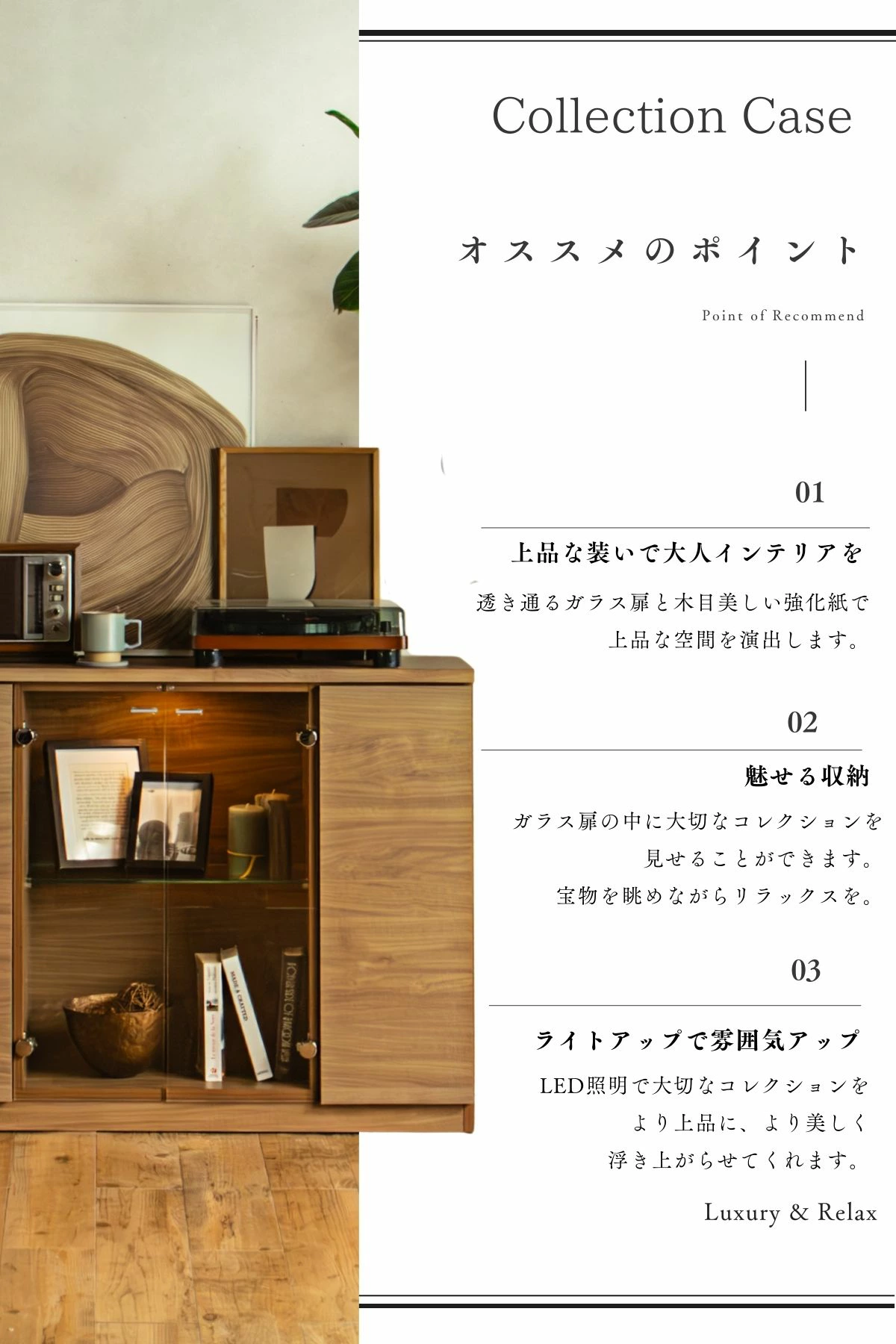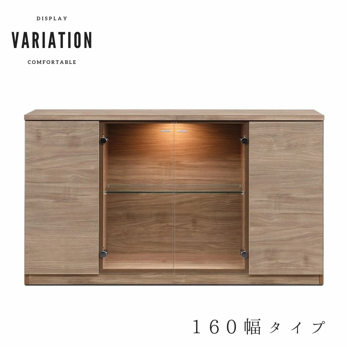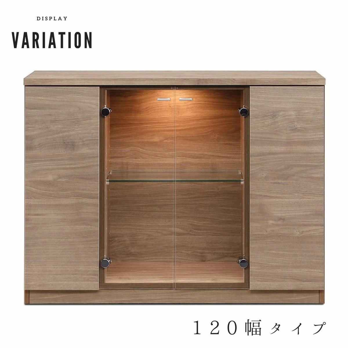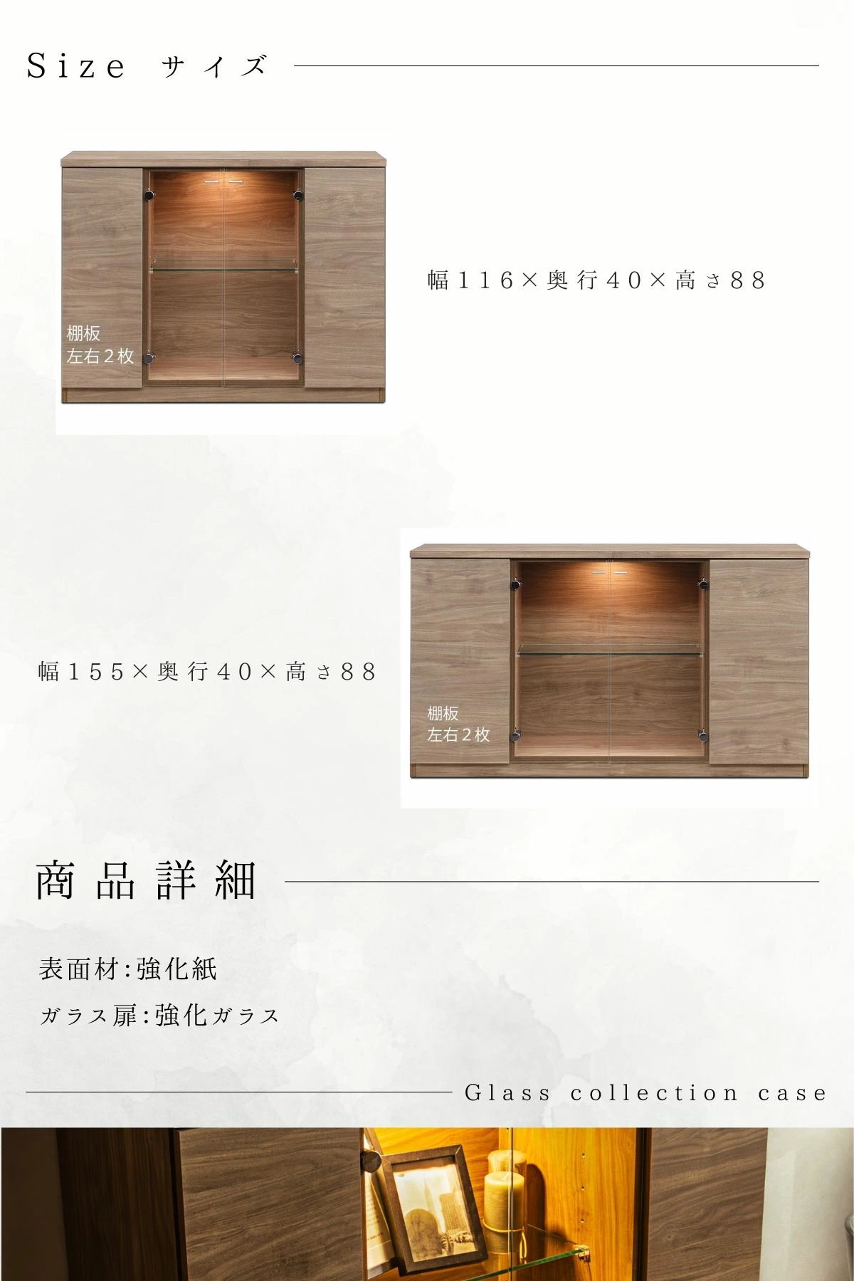 F02107_ガラスコレクションケース 強化ガラス 幅116/155 LED付き サイドボード コレクションボード 木目調 飾り棚 リビング収納 キャビネット 収納棚 ガラス扉 書斎収納 多目的ラック 木目調 ナチュラル リビング収納 宝物 ディスプレイ 開梱設置付き