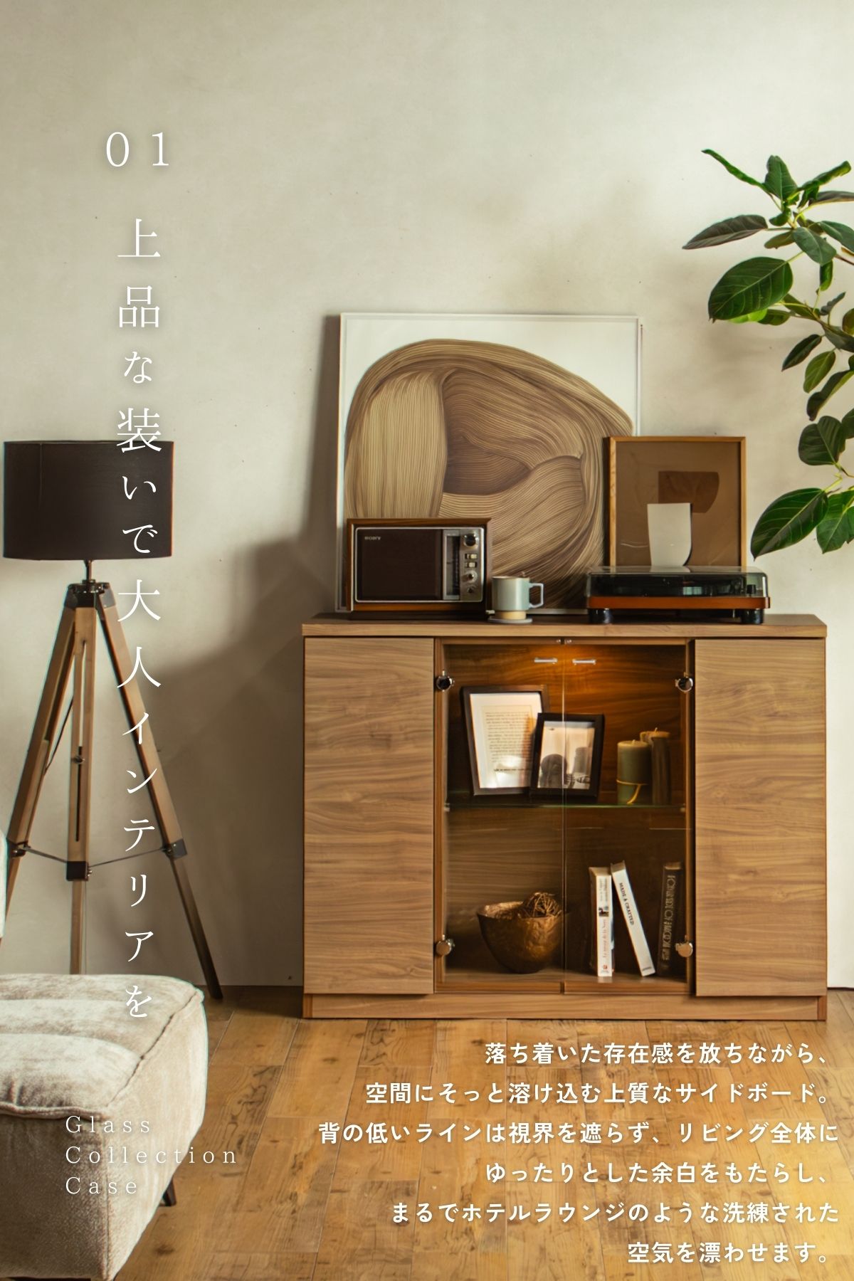 落ち着いた木目とガラスの組み合わせが、リビングに品のある抜け感を