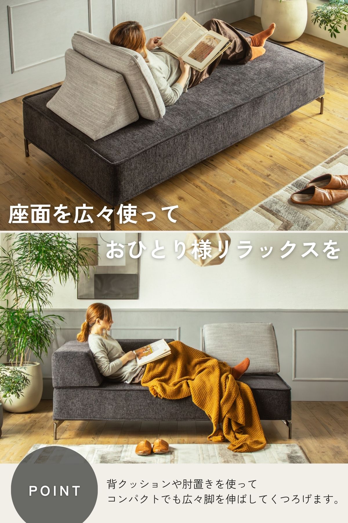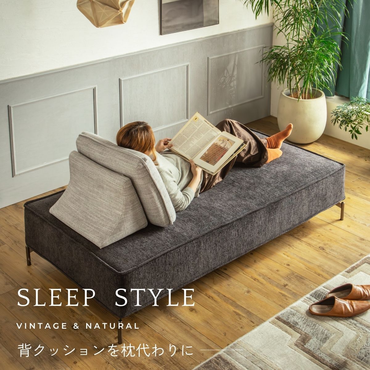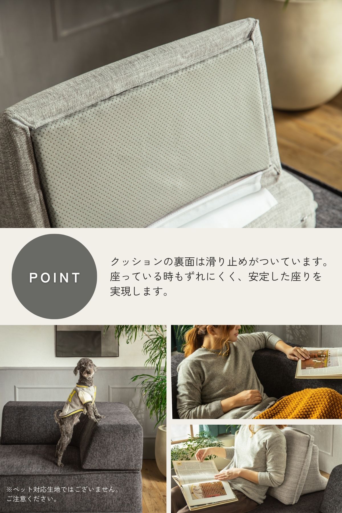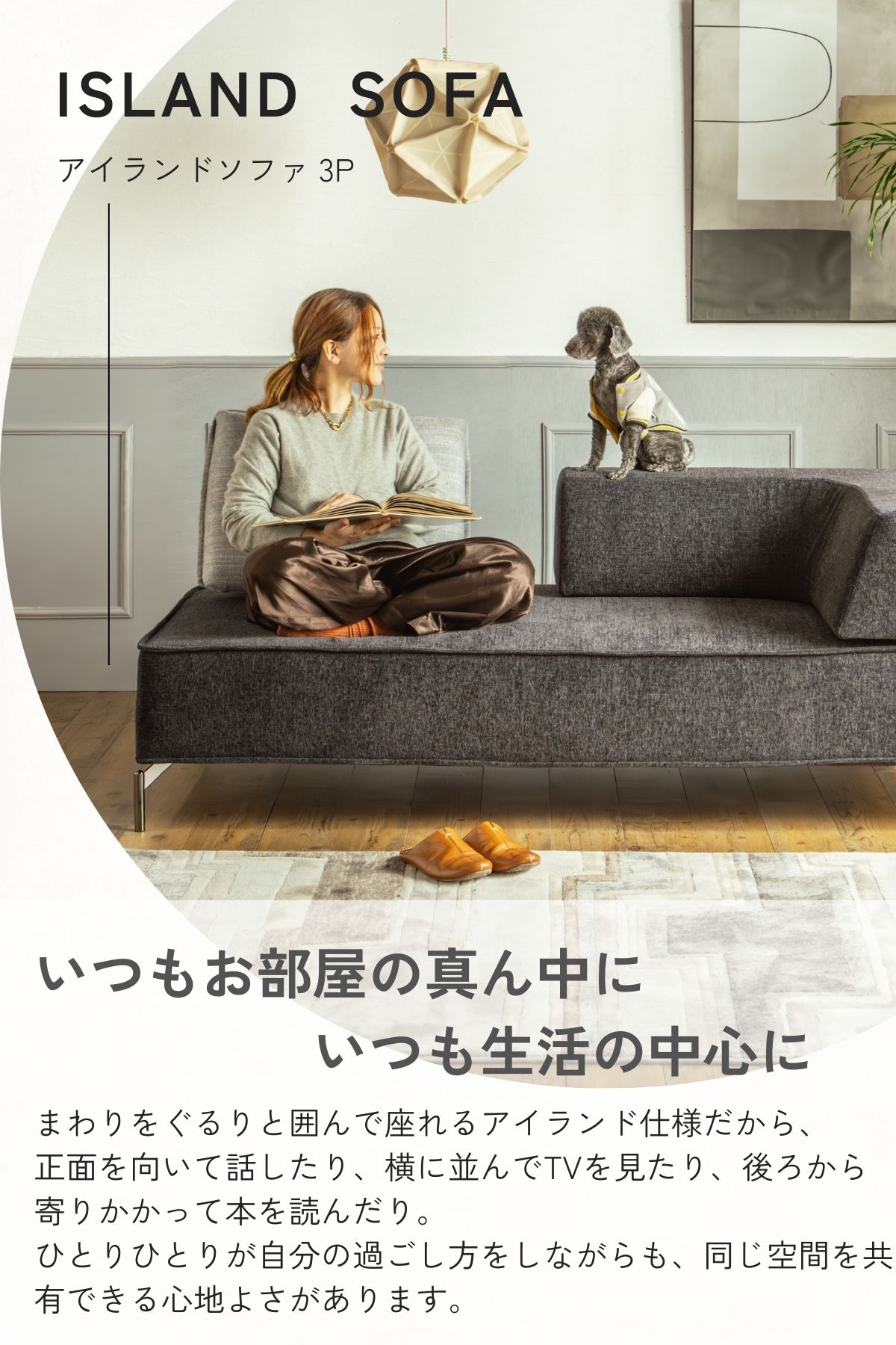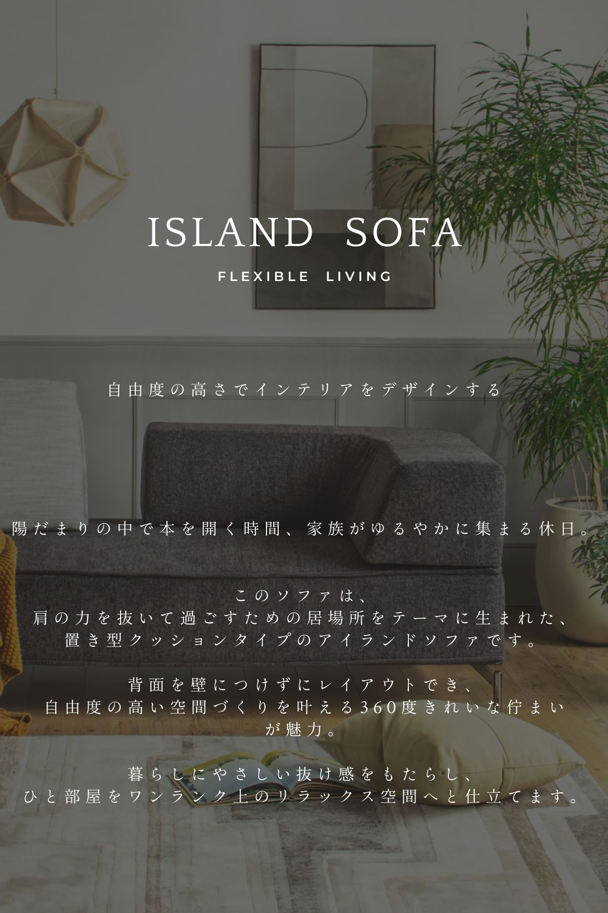 このソファは、肩の力を抜いて過ごすための居場所をテーマに生まれた、置き型クッションタイプのアイランドソファです。