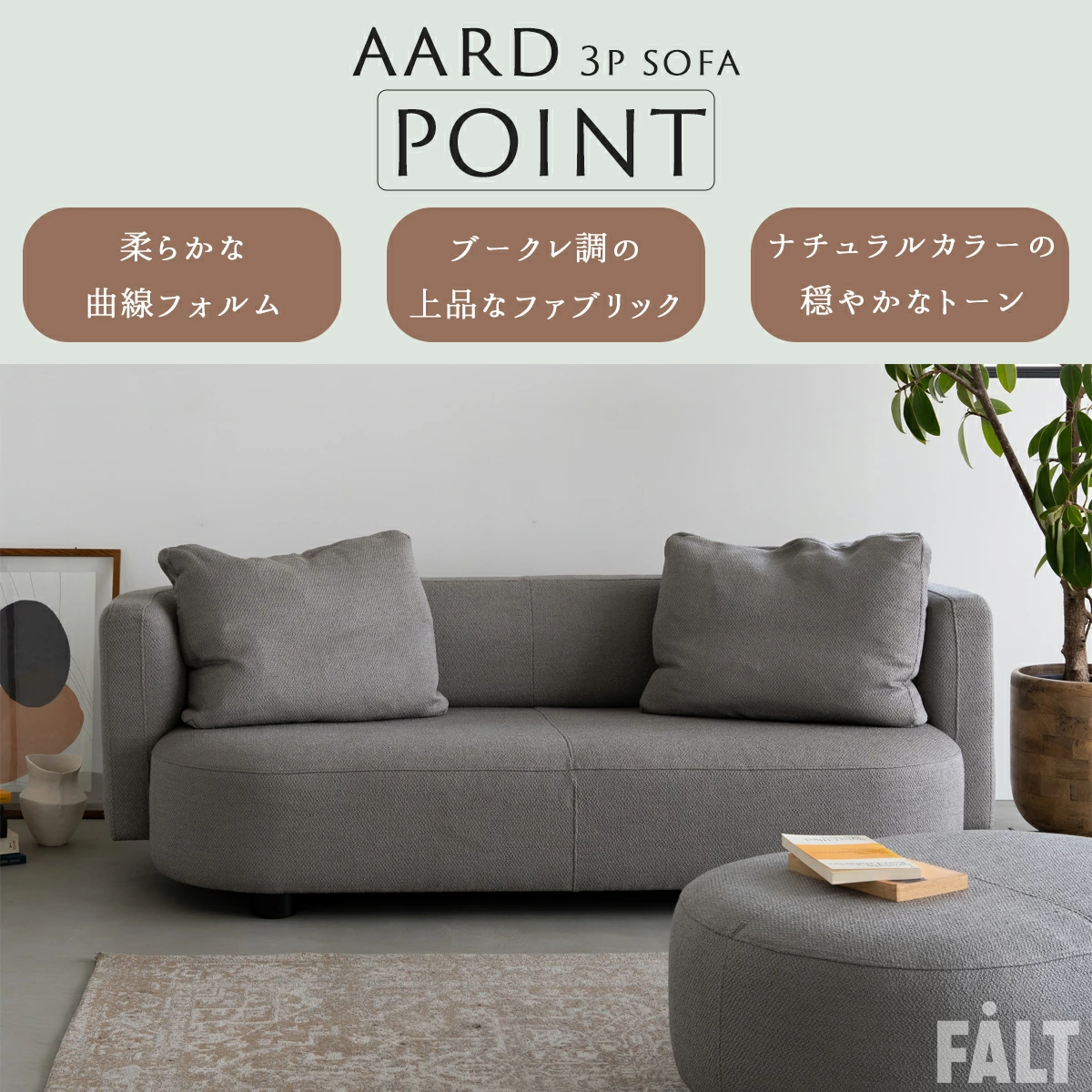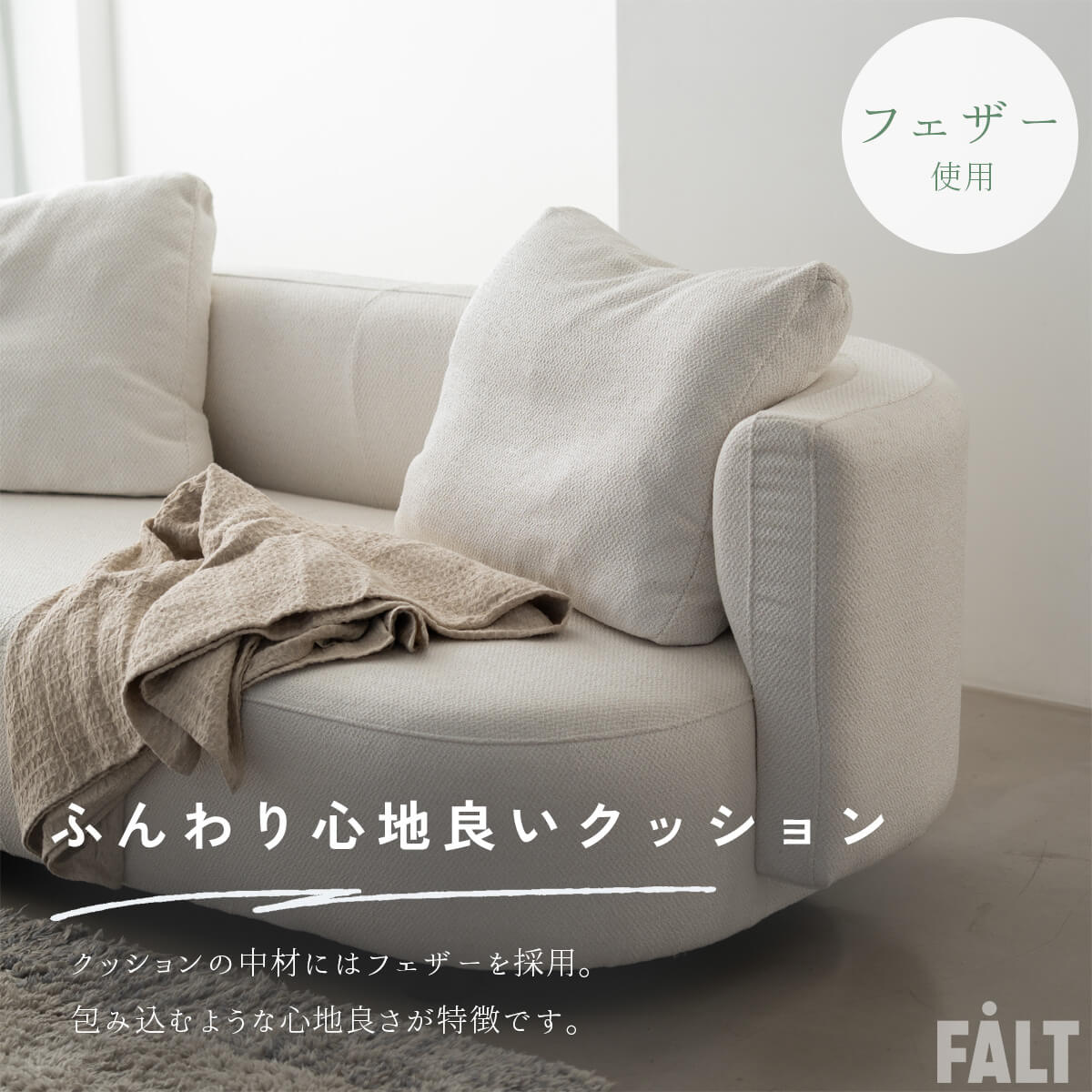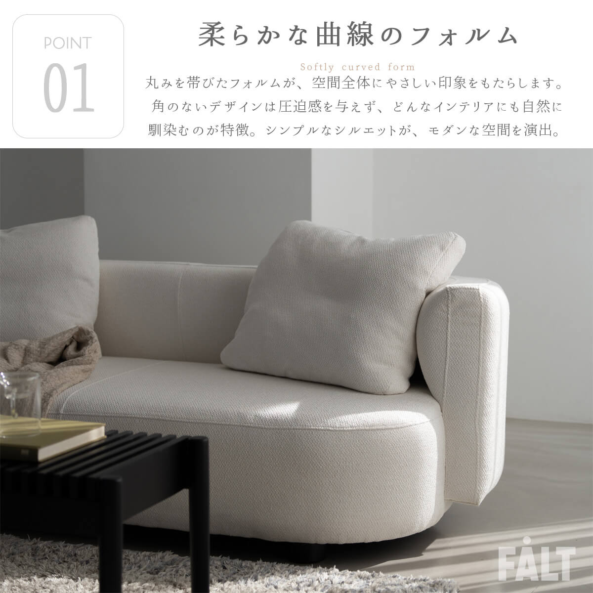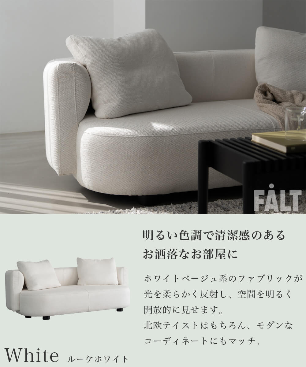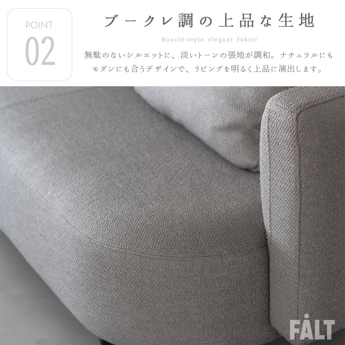 1.柔らかな曲線フォルム 2.ブークレ調の上品なファブリック 3.ナチュラルカラーの穏やかなトーン 4.高密度ウレタンとSバネによる快適な座り心地 5.背もたれの多層構造で包み込まれるリラックス感 |