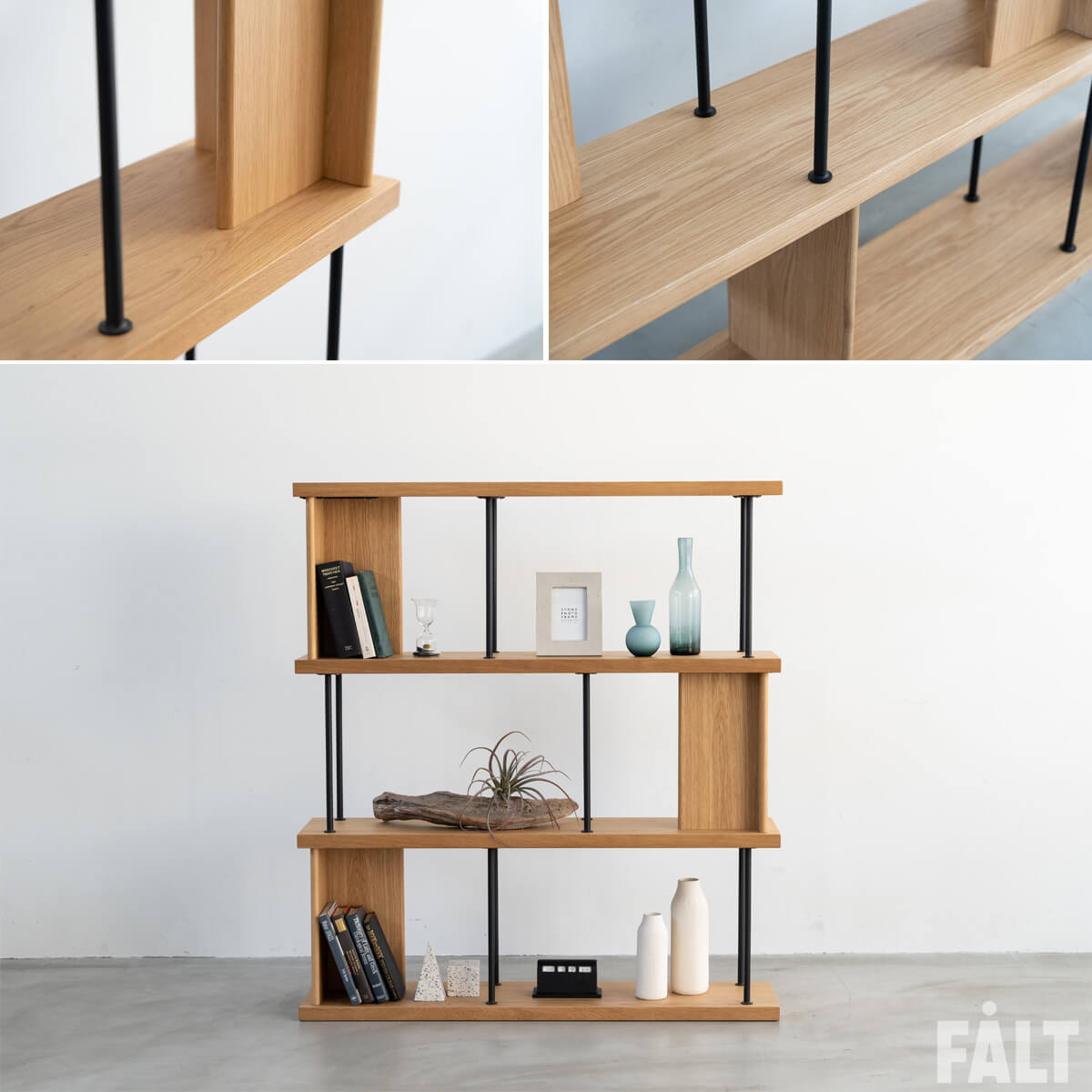 | 特徴 | ランダムな棚板の配置が美しいシェルフ。 シンプルながら個性的なデザインで、単体で置いてもお部屋のアクセントになります。 高さのある収納部は、花瓶や本も十分におさまるサイズ感です。 両面使用可能で、間仕切りとして使うなど自由にレイアウトできます。 |