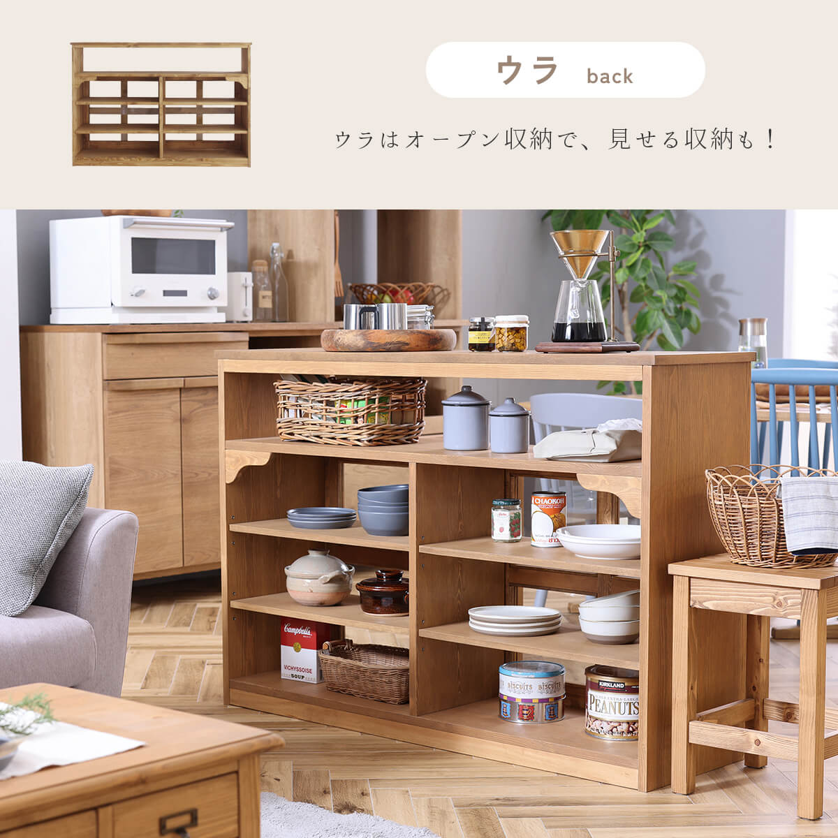 特徴 魅せる収納を楽しめる2WAYシェルフ。表と裏で異なった収納ができます。