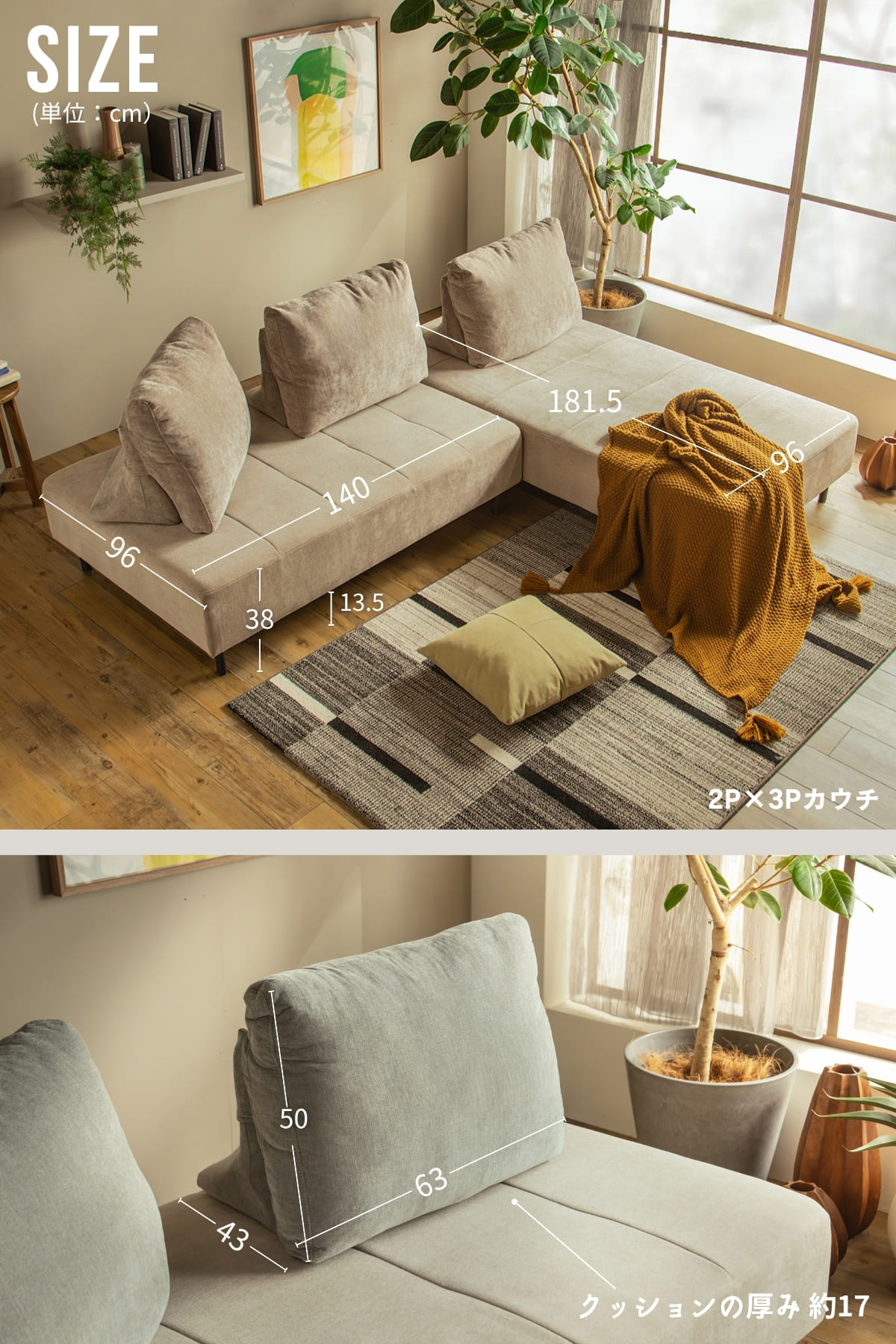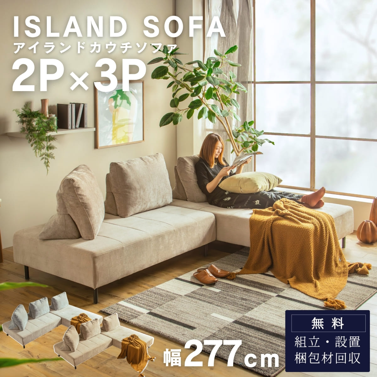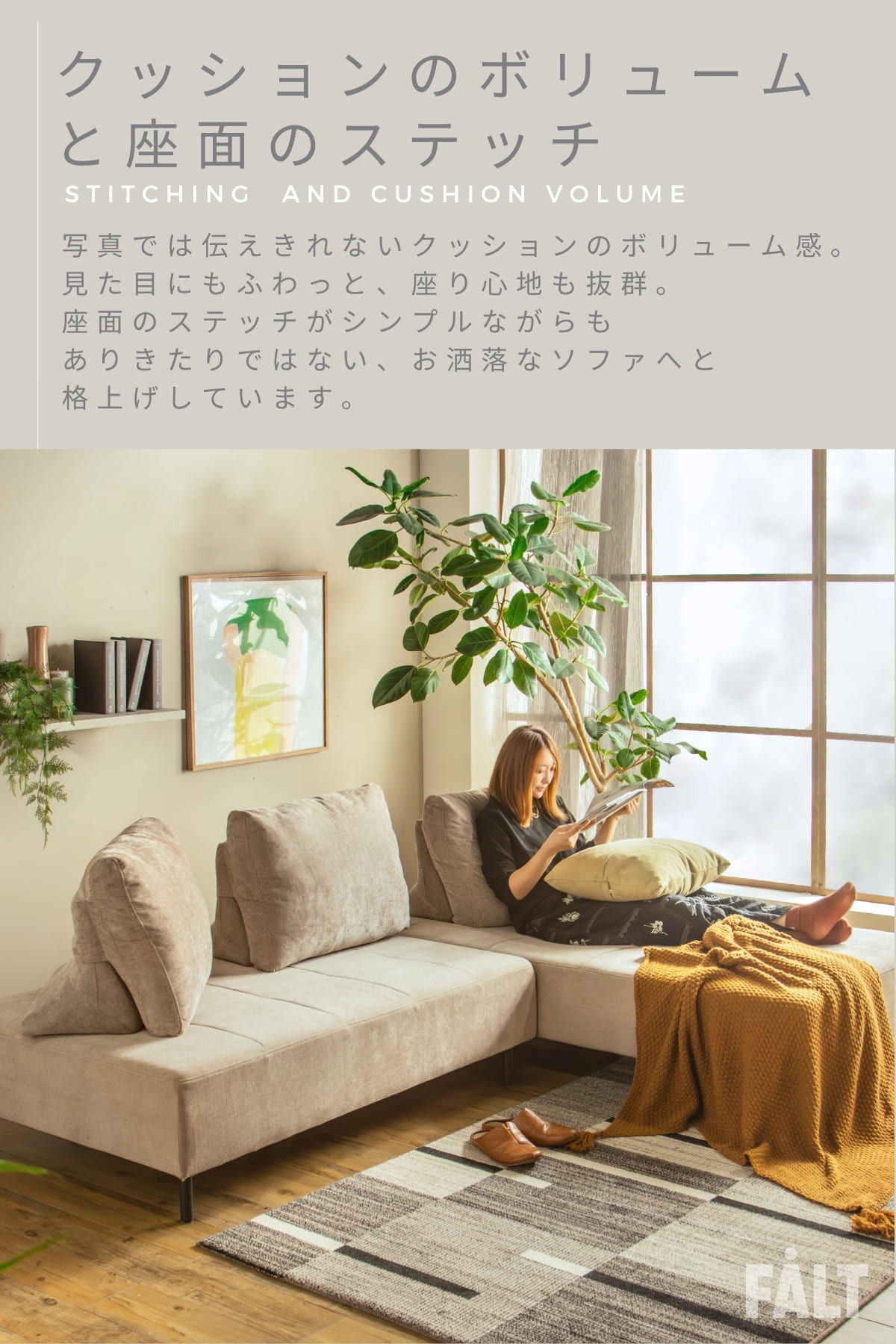 | 特徴 | 自由に組み替えできるアイランドソファ。 クッションセットの下には滑り止めもついて、フローリングでも使用できます。 カウチスタイルでも、分離して別に使っても、組み替えは自由自在! |