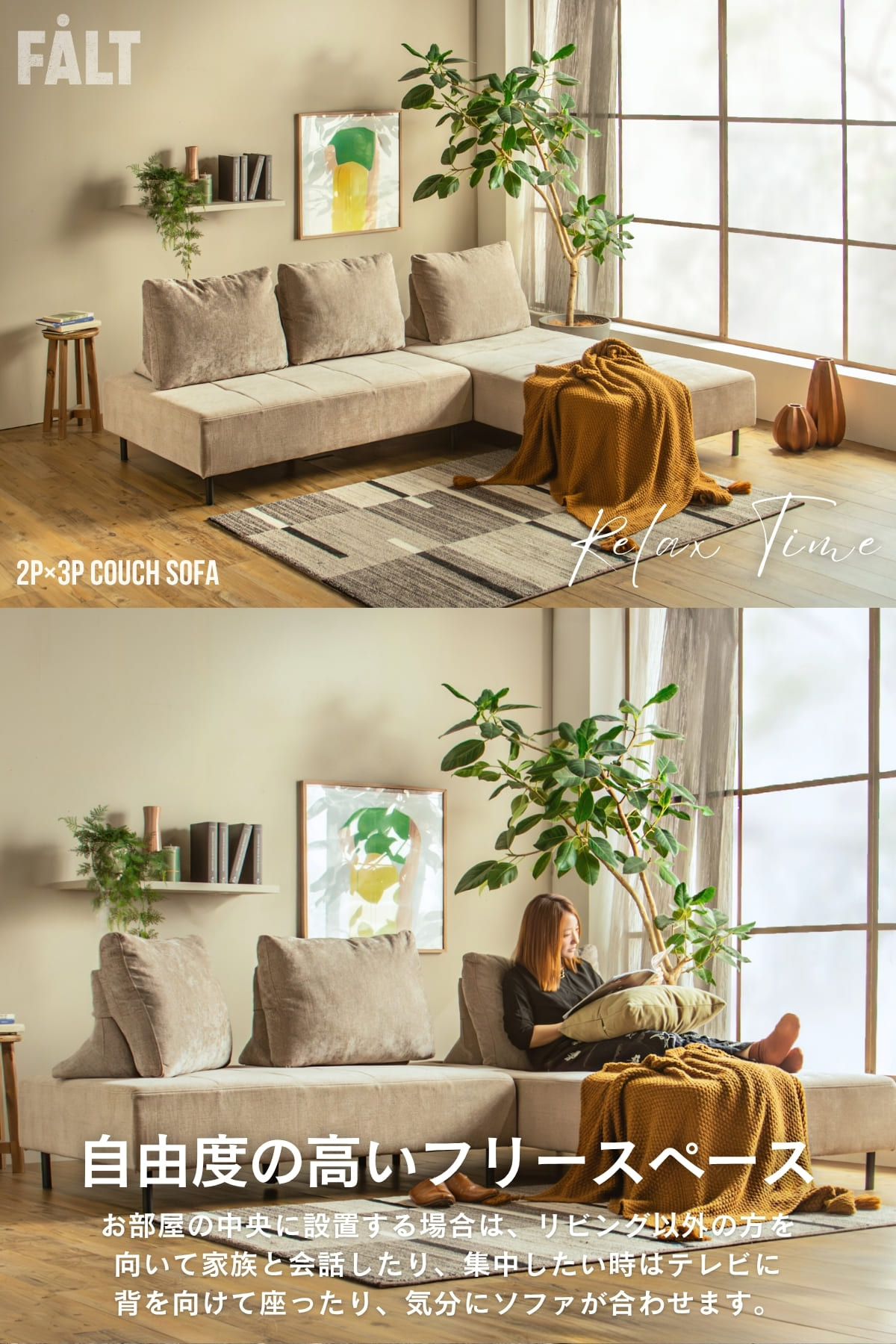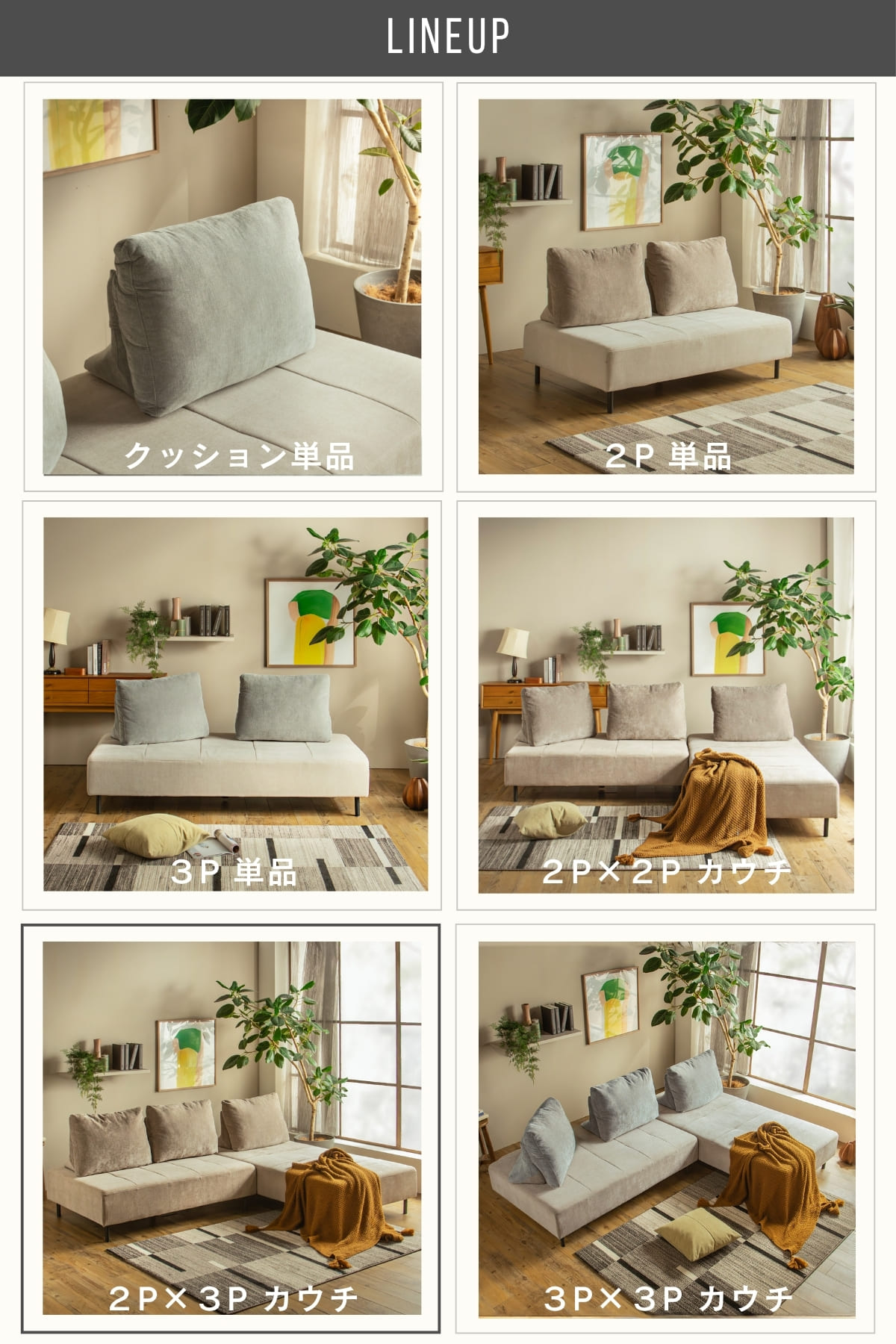 F02184_カウチソファ 2P×3P アイランドソファ 組み替え アレンジ デイベッド 床置き クッション バイカラー 模様替え 秘密生地 ファブリック グレー ベージュ ナチュラル お洒落 韓国インテ 開梱設置付き