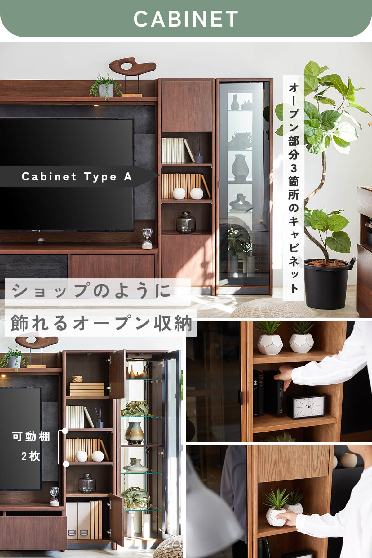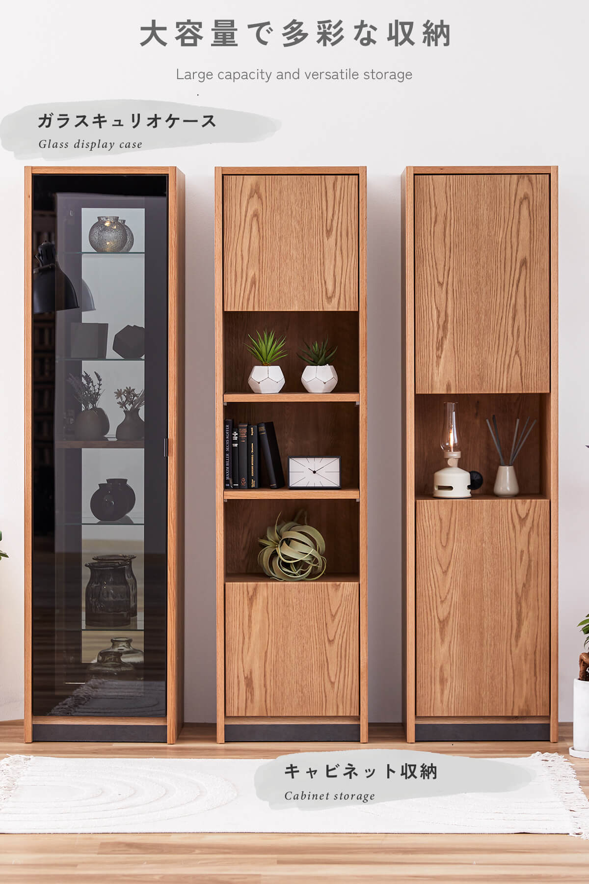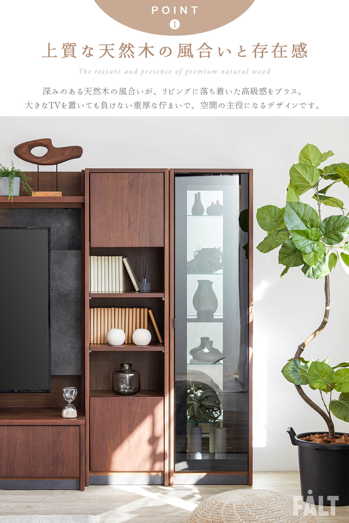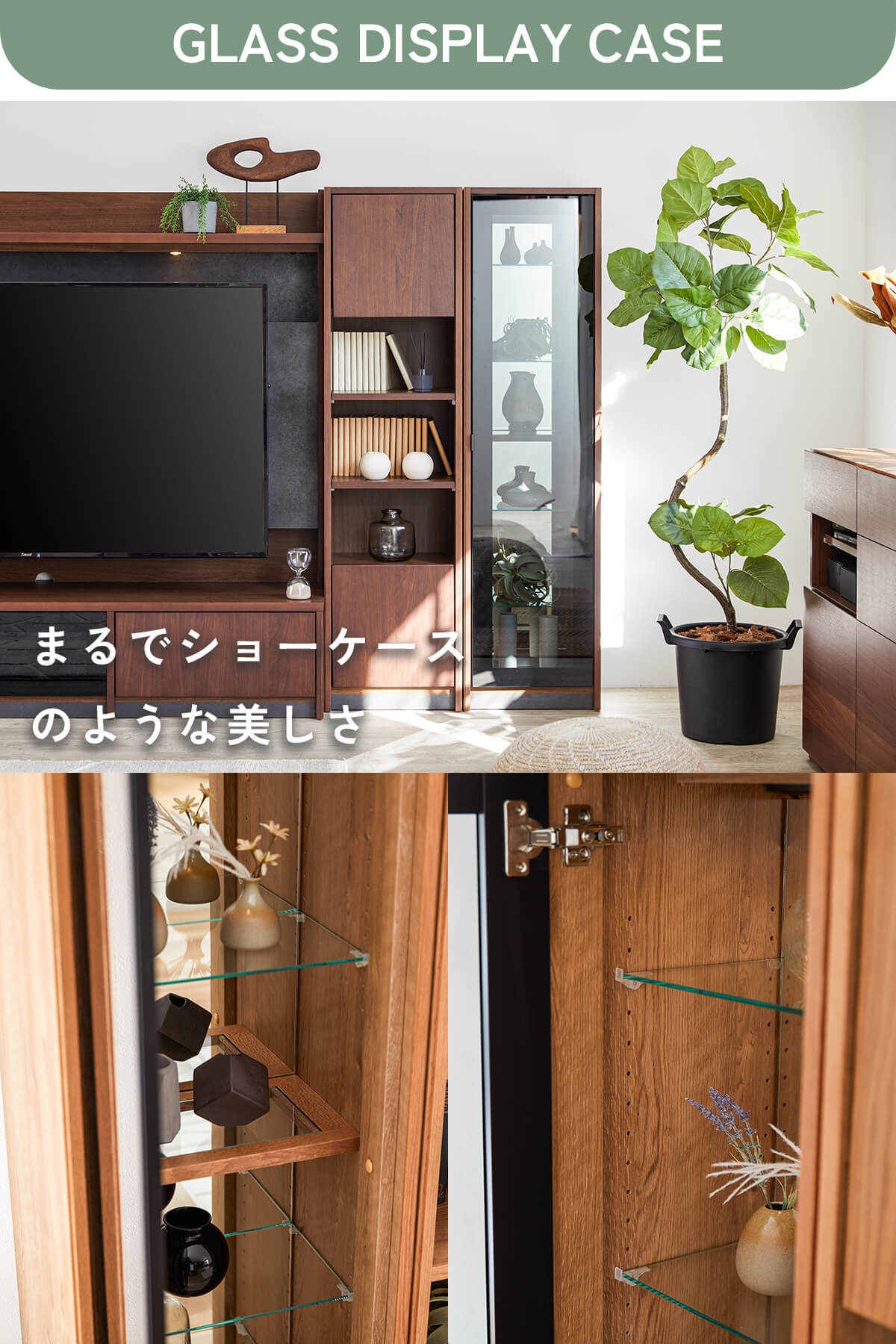 上質な天然木の風合いと、美しく見せるガラスキャビネット、たっぷり収納できる扉収納を組み合わせ、リビングを上質な空間へと導きます。