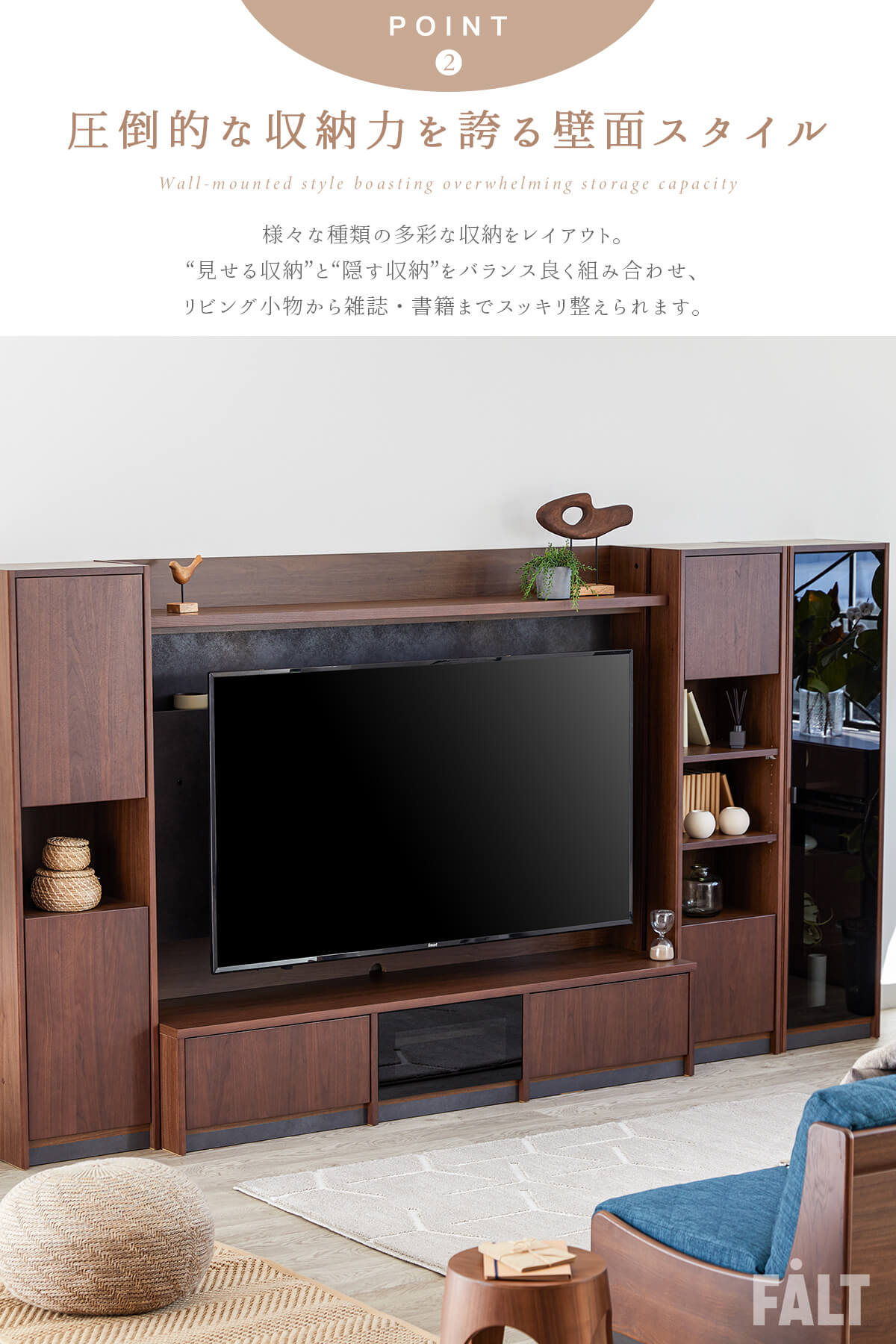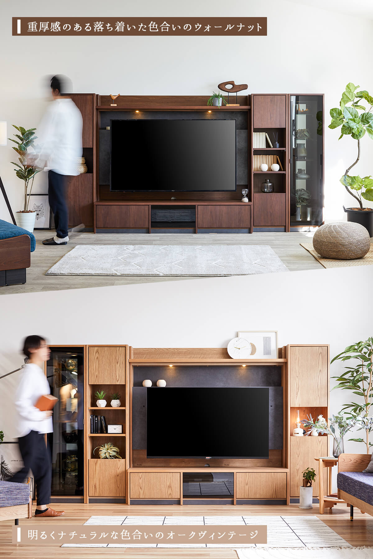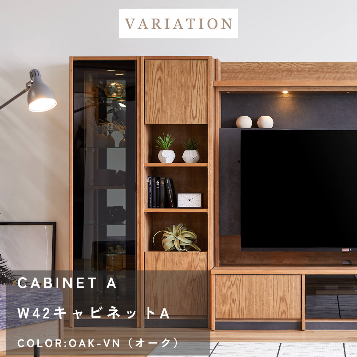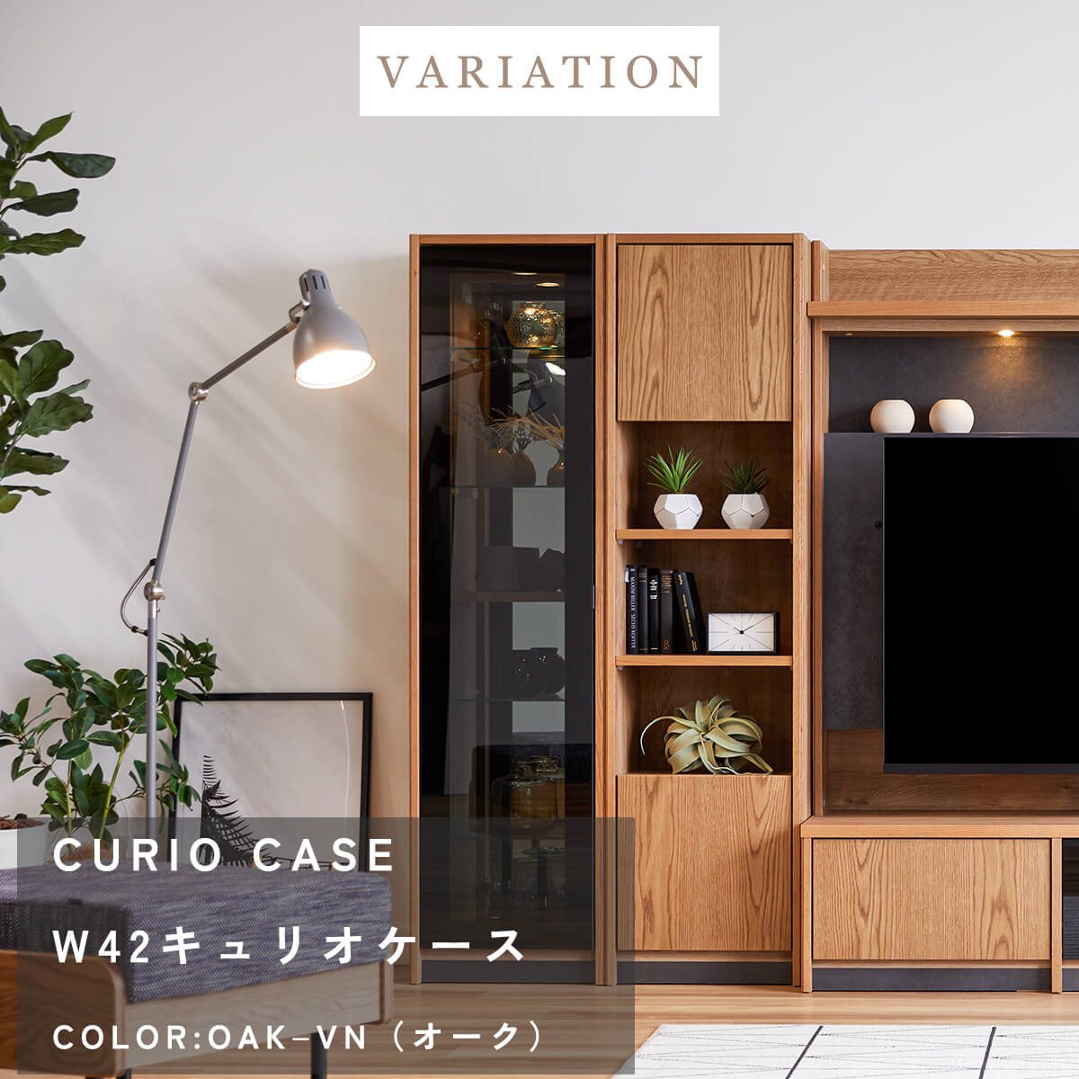 上質な天然木の風合いと、美しく見せるガラスキャビネット、たっぷり収納できる扉収納を組み合わせ、リビングを上質な空間へと導きます。