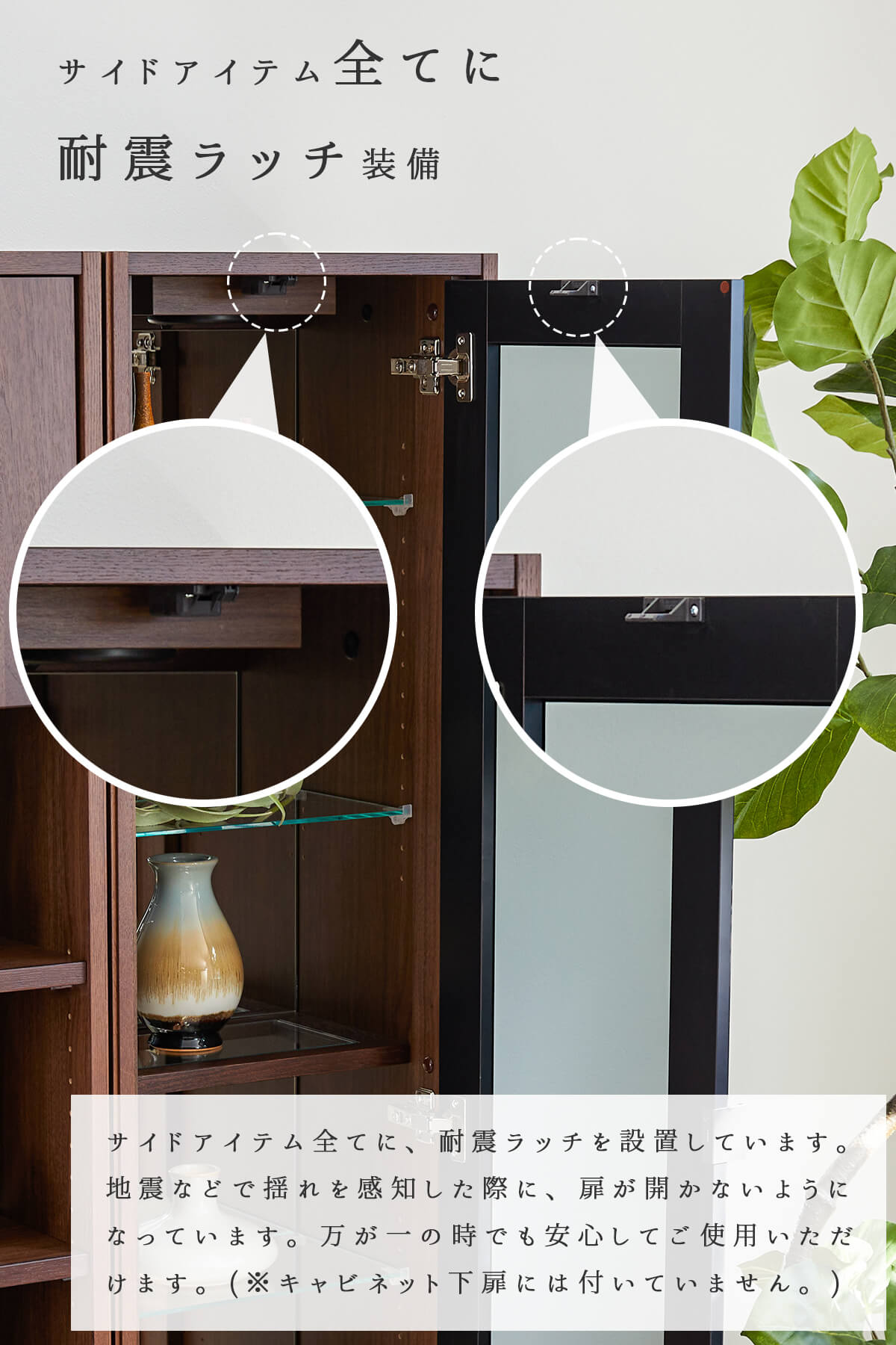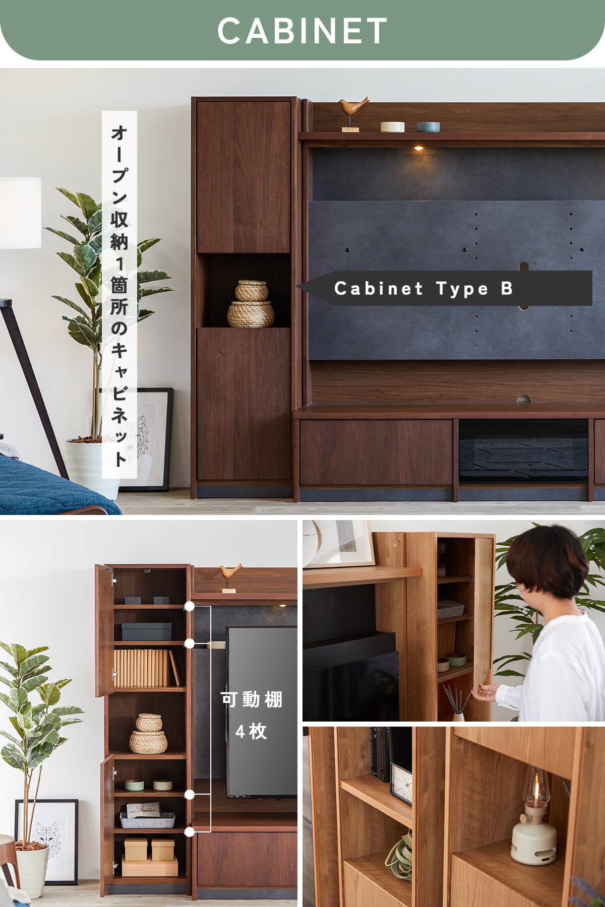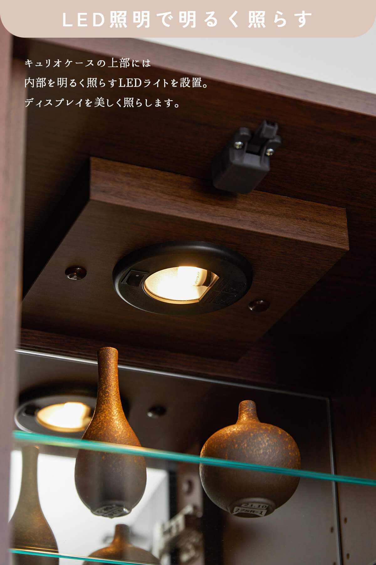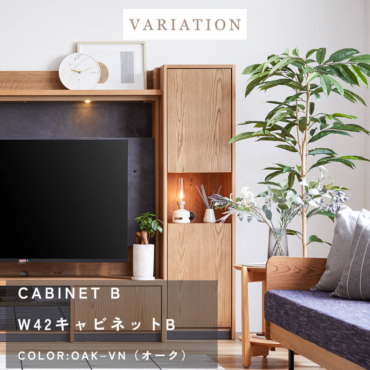 上質な天然木の風合いと、美しく見せるガラスキャビネット、たっぷり収納できる扉収納を組み合わせ、リビングを上質な空間へと導きます。