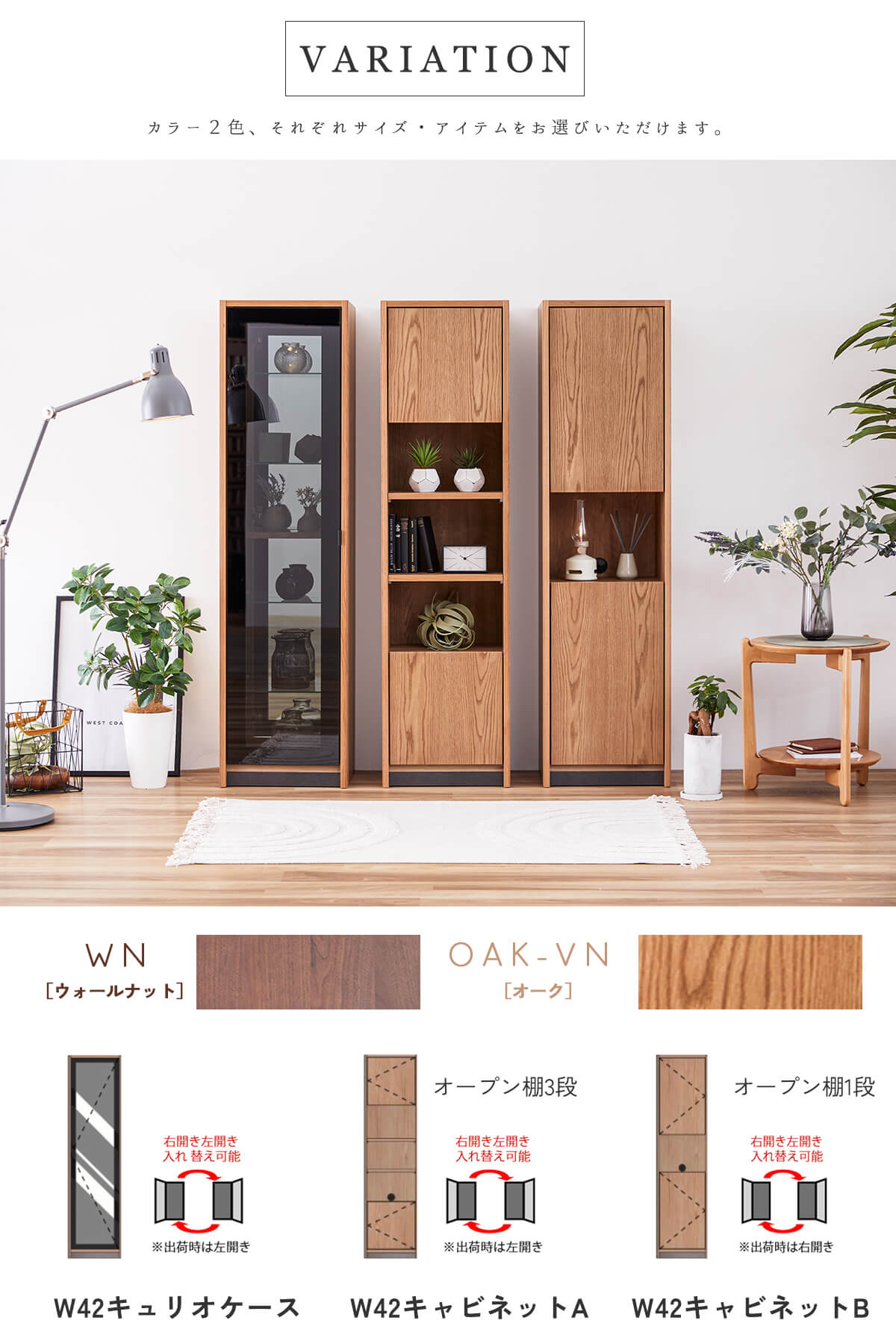 前板・板扉:OK-VN:オーク突板・MDF、WN:ウォールナット突板・MDF