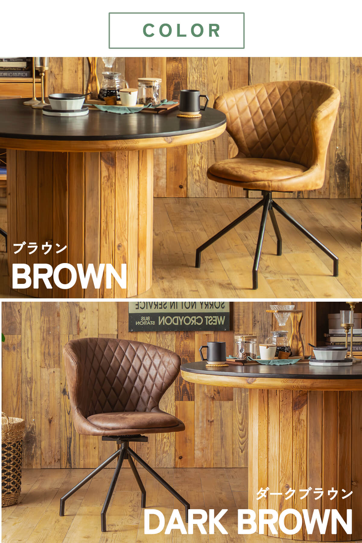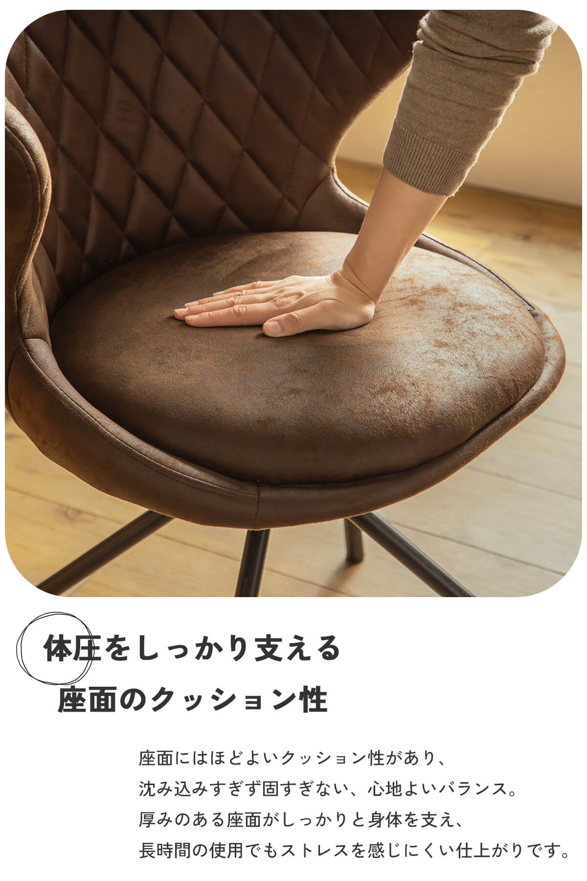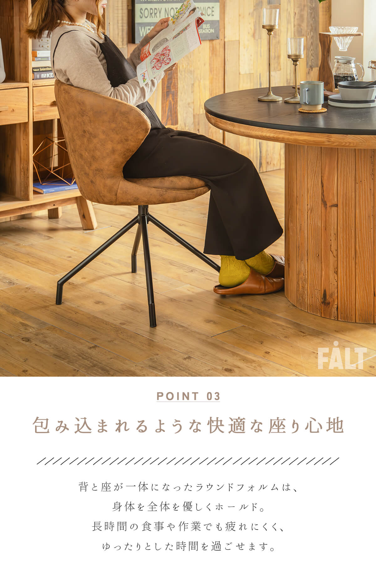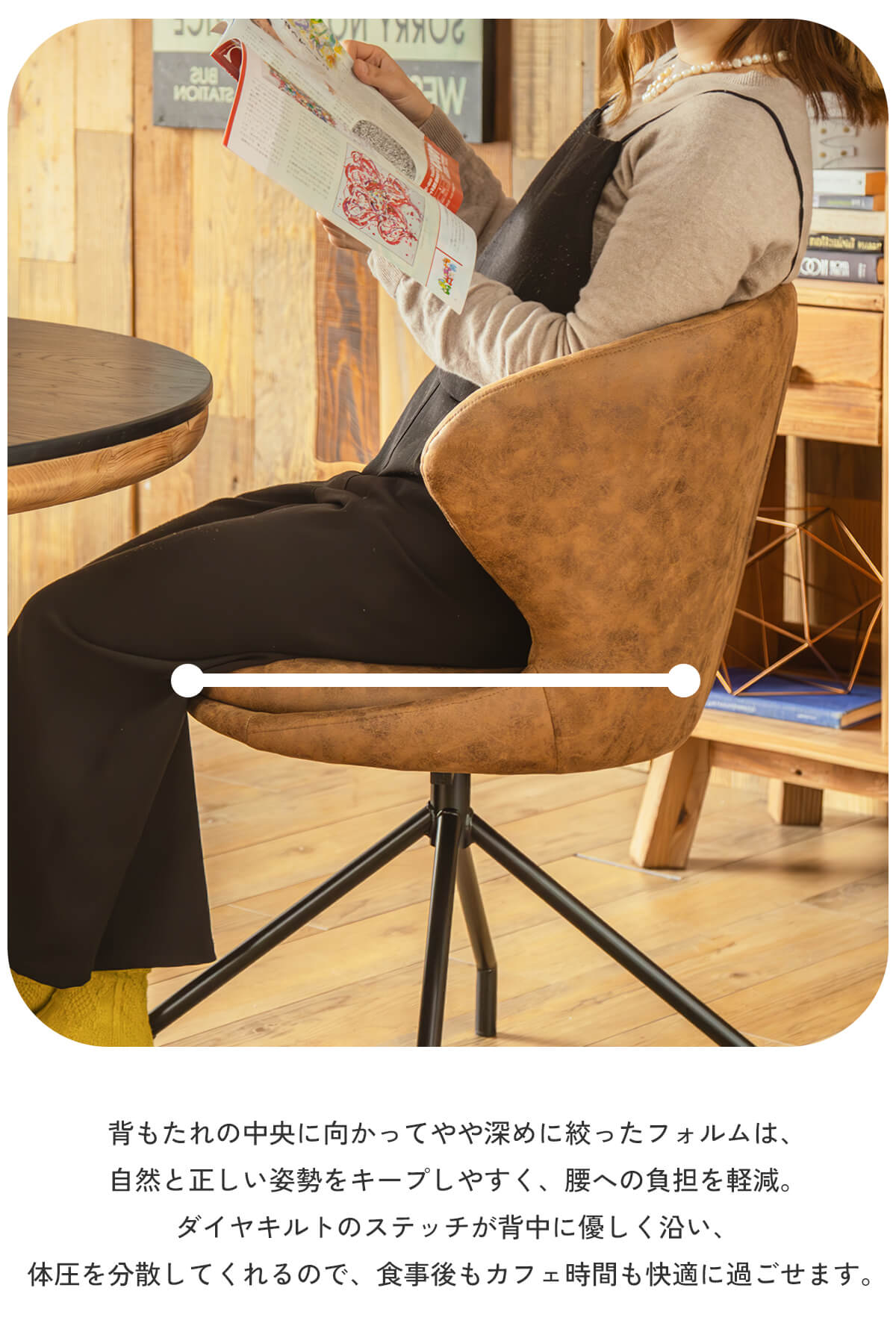 特徴 ヴィンテージの風合いと現代的な快適性を兼ね備え存在感あふれるダイニングチェア。